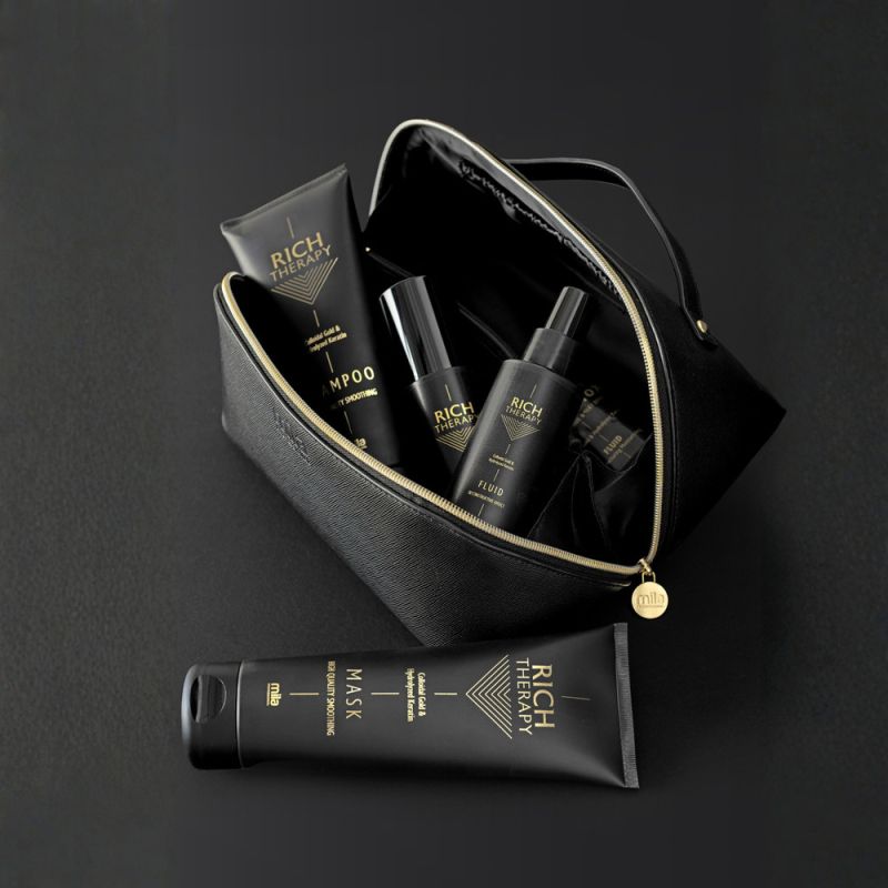Избирайки комплекта Mila Pro Rich Therapy, получавате цялостна, професионална програма за възстановяване, допълнена от експресна кератинова терапия. Това е интензивна доза лукс и регенерация в елегантна, подаръчна опаковка с практична козметична чантичка. Поглезете себе си или любим човек с луксозна терапия, която ще възстанови предишната сила и красота на косата.